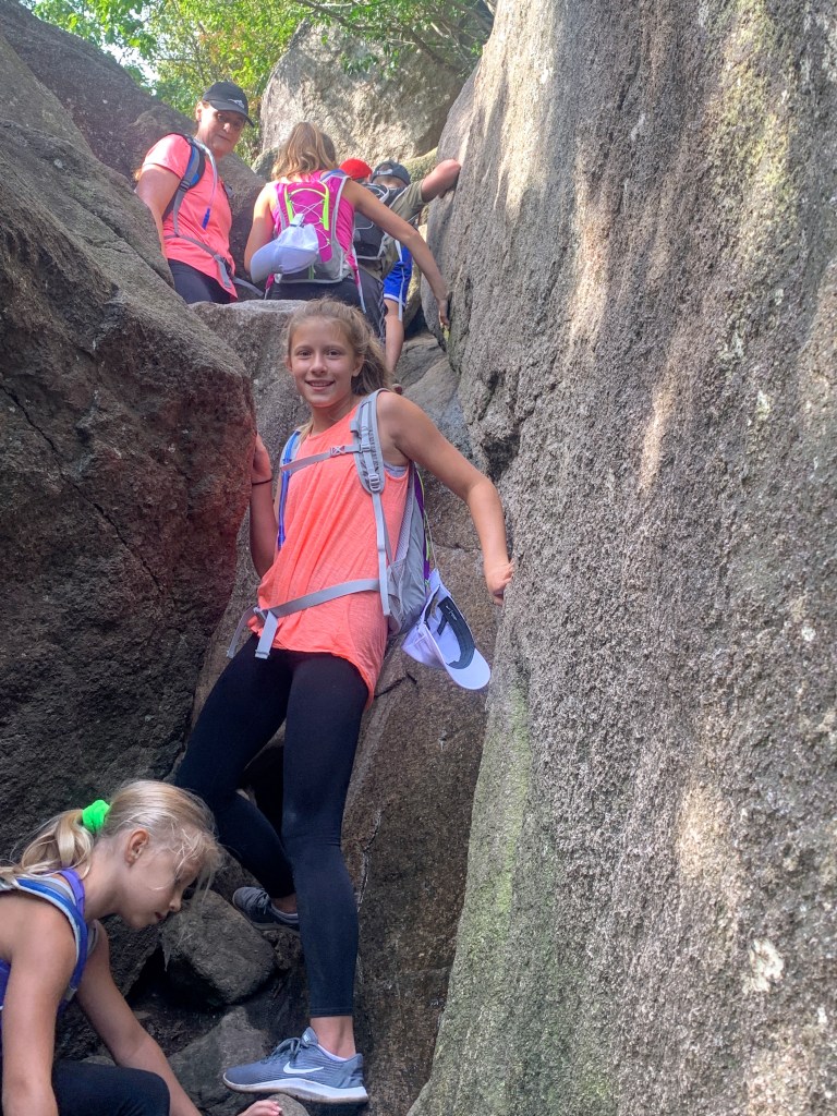 Things took a turn at the boulder scramble. If you’ve never done it, the scramble is not for the faint of heart. We ducked through narrow crevices (backpacks off!), climbed up and over rocks, lowered ourselves down steep drops, and even had to take a leap of faith across a narrow gap. And something beautiful happened – the kids lit up. With each rock obstacle, they grew more animated. Conversations started. Laughter echoed. The magic of shared adventure kicked in.