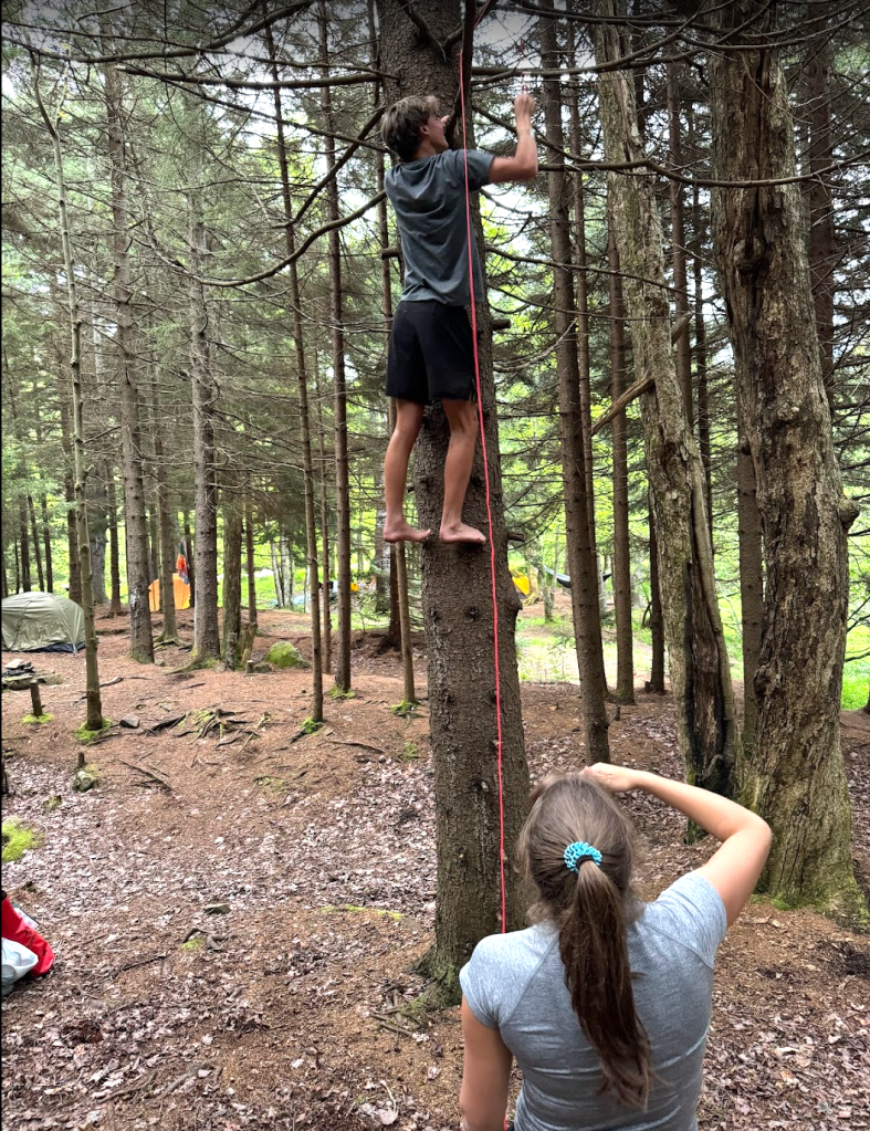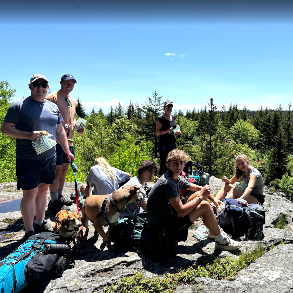 We eventually found a quiet clearing near the river, perfect for tents, a hammock (rookie mistake: only one hammock), and a fire circle. We set up our tents, started filtering creek water, and rigged our bear bag high in a tree. “Rigged” might be generous, we got it stuck. Adam, in classic fashion, ended up climbing the tree to get it down, while the teens cheered him on and later played “be the bear” by trying to see if anyone could jump high enough to touch the dangling bag.