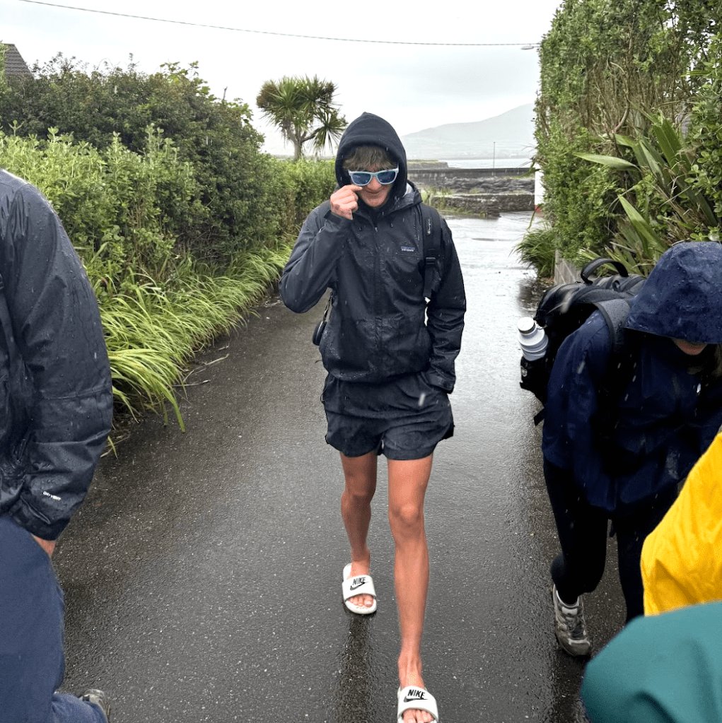 Before we even left home, I’d bought brand-new, bright-white hiking shoes. They were beautiful. They were also a trap. I forgot to break them in, and by Day 3 my feet staged a full-on rebellion. The blisters were so bad I ended up hiking 10 miles in slides. Yes, actual slides. Through Ireland. Locals looked at me like I was either completely unhinged or some kind of legend. Honestly, I wasn’t sure which I preferred. Every step was a mix of “Why am I doing this?” and “This is going to make the best story later.”
