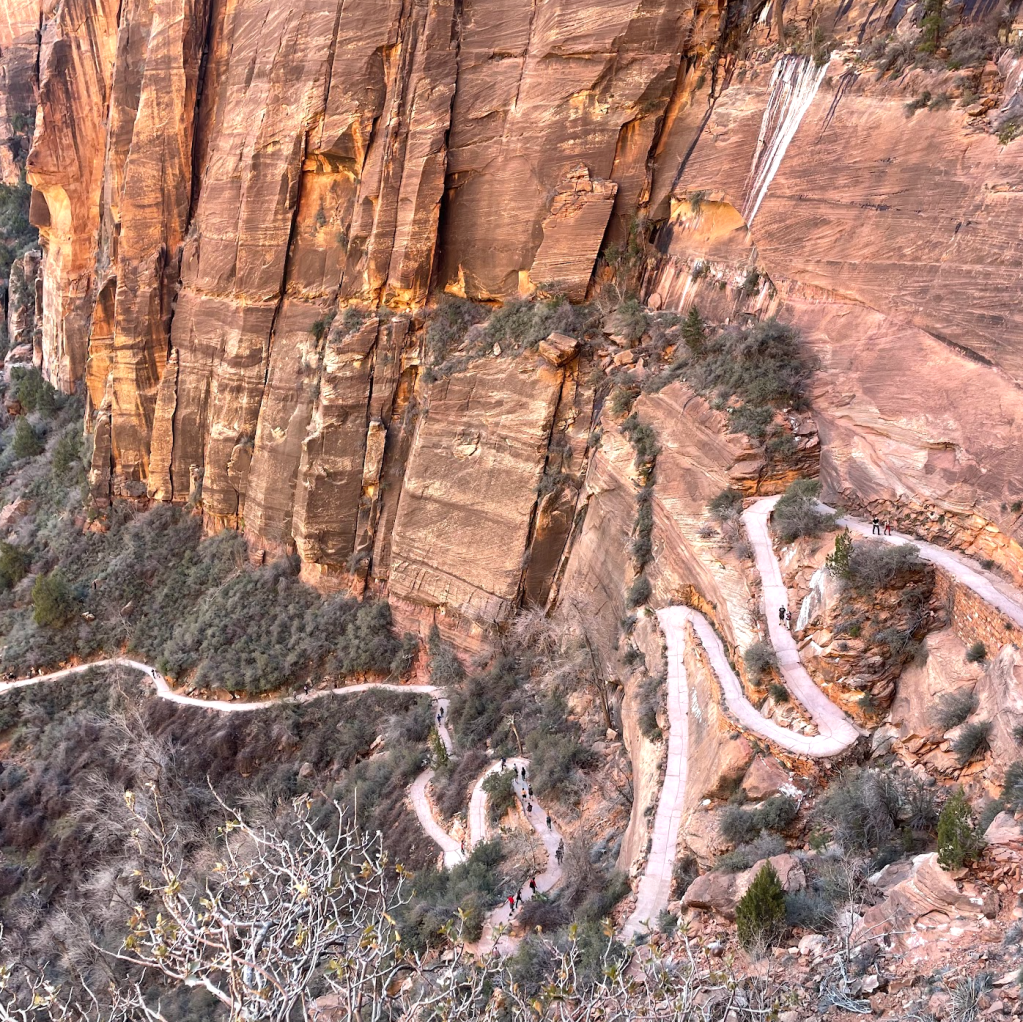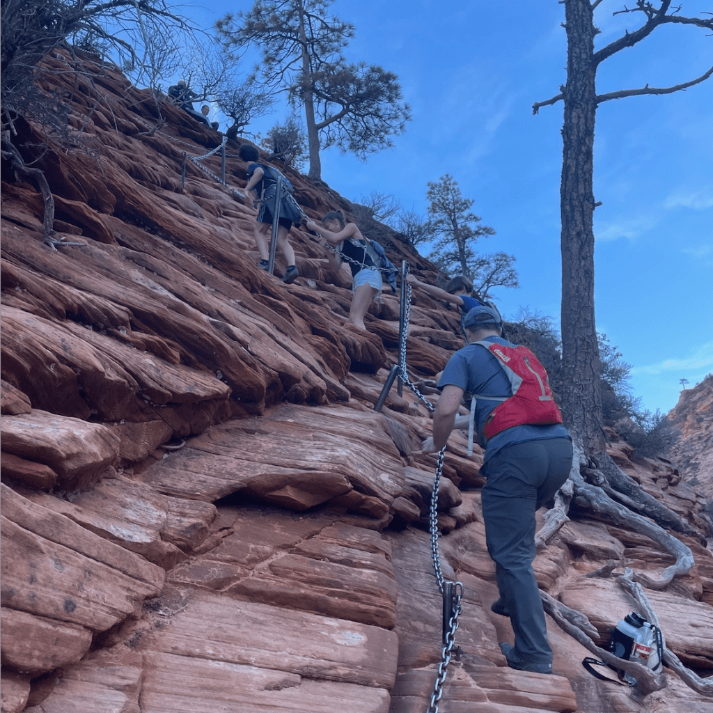 Then came Walter’s Wiggles, 21 famously tight switchbacks that snake straight up the rock. We’d already huffed and puffed through steep sections, but this was another level. (Pro tip: don’t be fooled by the earlier switchbacks, the real Wiggles are unforgettable.) Dramatic, exhausting, but oddly fun, they delivered us to Scout Lookout, the gateway to the most notorious stretch: the chains.