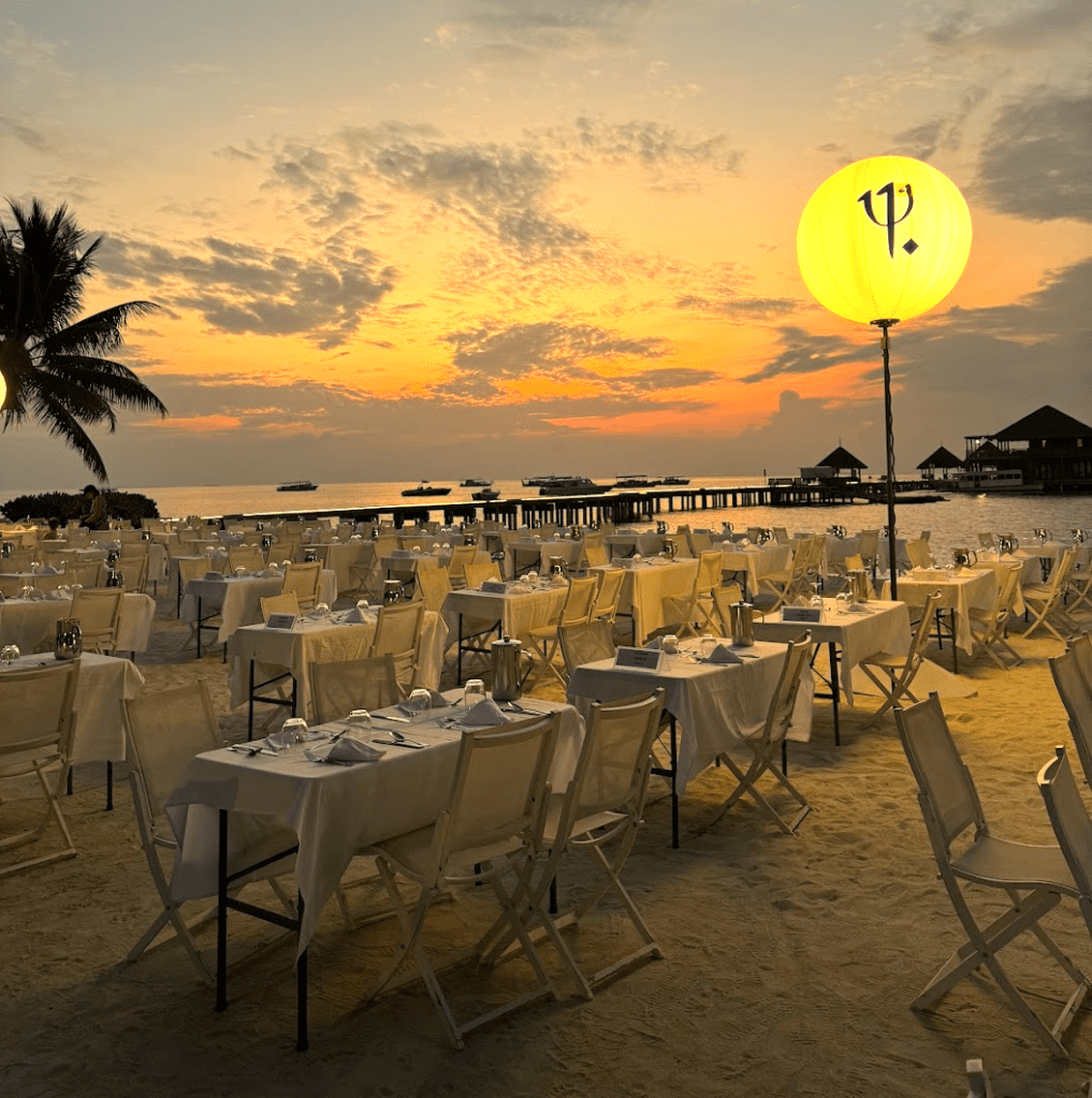 From that moment on, the island delivered everything we’d dreamed of. Club Med Kani sits on its own island, about 1 km long, which you can walk around in about 20 minutes. White sand everywhere. Sunrise on one side, sunset on the other. Swings over the water, poolside lounging, and warm ocean swimming at every turn.