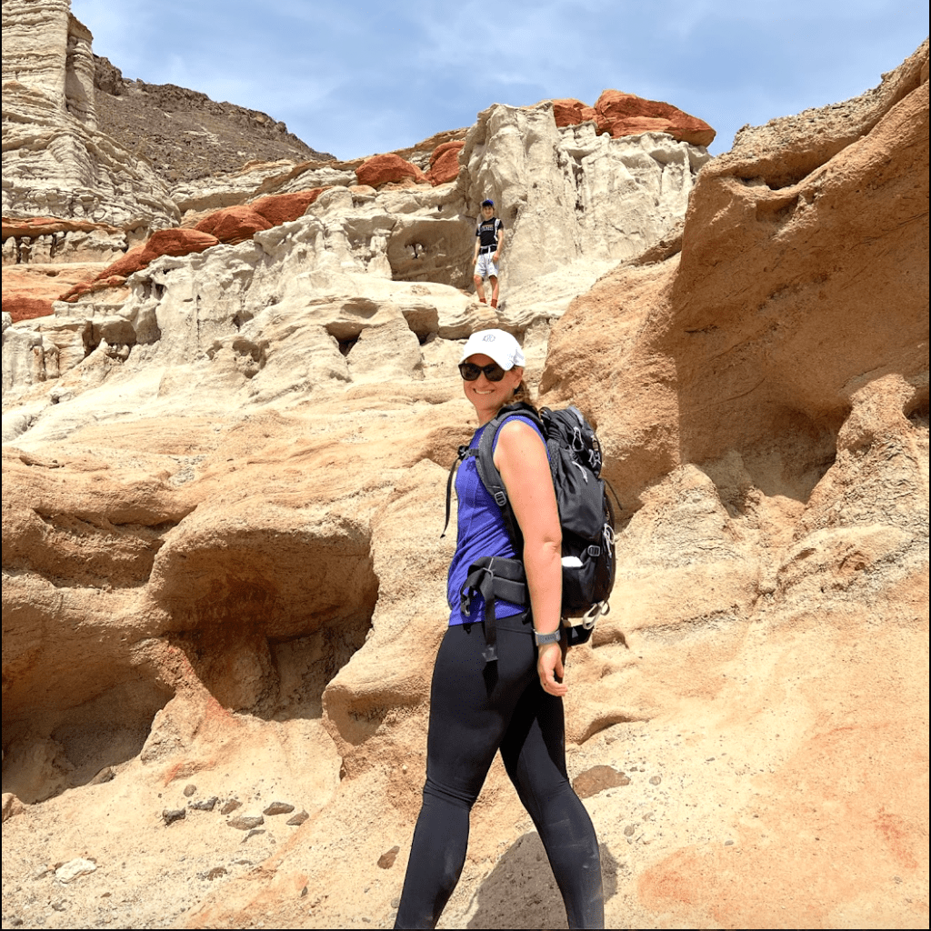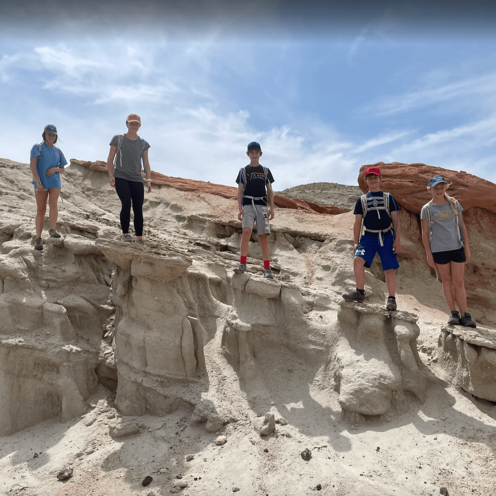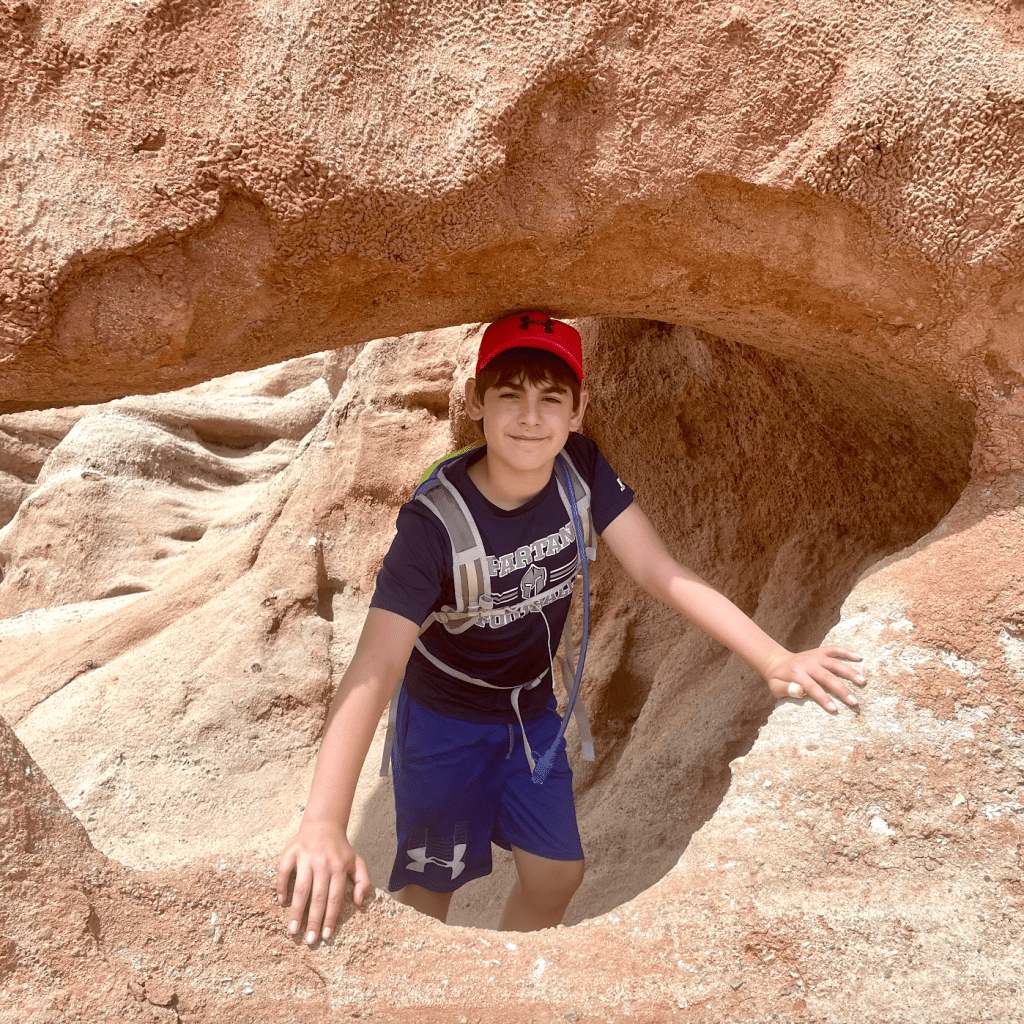 The trail itself is short, flat, and beautifully maintained. Off-trail exploration is allowed too, which meant the teens scrambled up rocks, we posed for ridiculous photos, and everyone got to play “explorer” for half an hour. We didn’t see another soul while we were there, so it felt like we had our very own desert playground.